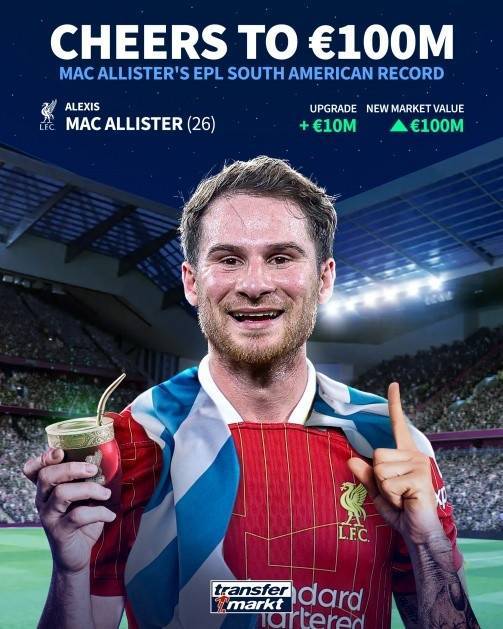 直播吧5月31日讯 德转昨日更新英超球员身价,利物浦中场麦卡利斯特身价达到1亿欧。据德转统计,这也是英超历史上身价最高的南美球员。